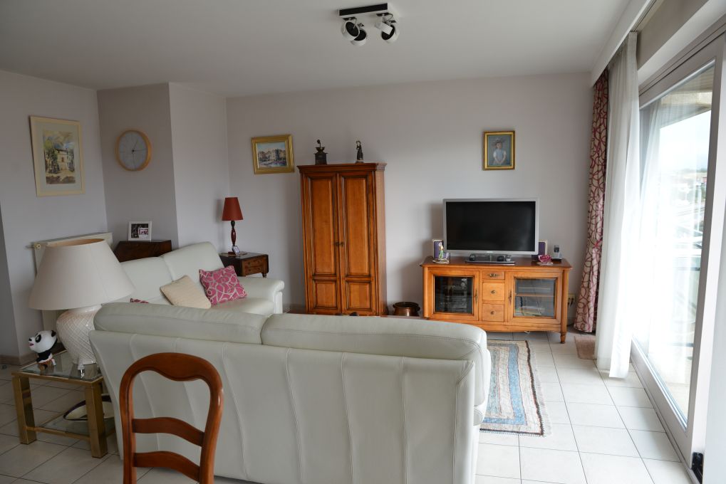 spacieux living avec baie vitrée et balcon. Cuisine intégrée américaine