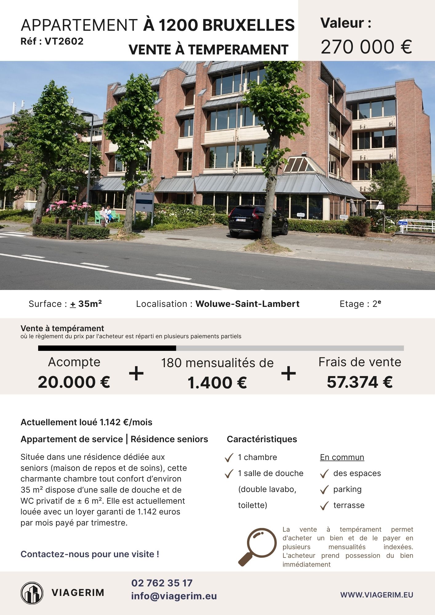 Un achat à tempérament est particulièrement intéressant puisque l’acquéreur achète un bien qu’il peut occuper ou mettre en location à partir de l’acte, contre paiement au(x) vendeur(s) d’un comptant ou acompte puis d’une mensualité indexée et déterminée sur une période limitée, ici, de 15 ans, une sorte de financement mais SANS intérêt. Ce qui revient à dire que l’acquéreur aura le financement gratuit. Il devra souscrire une assurance solde restant dû. La mensualité sera indexée.